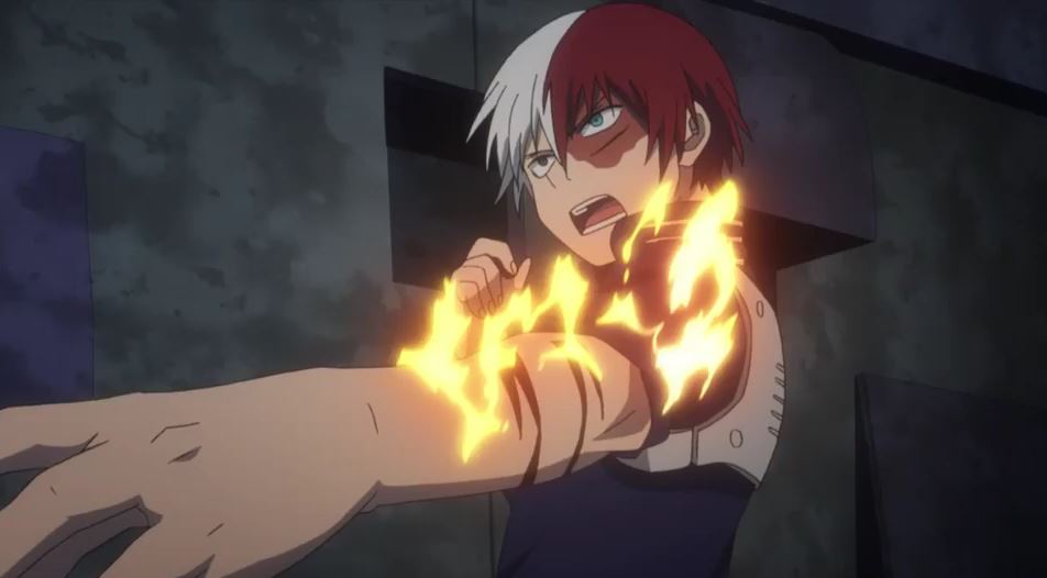 体育祭で出久とぶつかり合う轟くん。父親への恨みから「炎」の個性を封印し「氷」だけで戦っていた。
